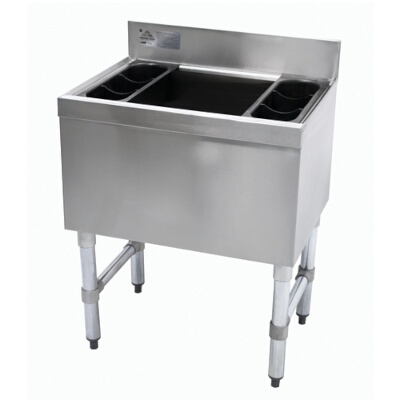 Advance Tabco SLI-12-24 Underbar Basics Cocktail Unit, 12" deep chest, 24"W X 18"D X 33"H, 4" splash, 77-lbs. ice capacity, (2) plastic bottle racks, 22/300 series stainless steel ice bin, front apron & backsplash, 20/430 stainless steel sides, galvanized legs with adjustable bullet feet, NSF. Standard 1 year warranty