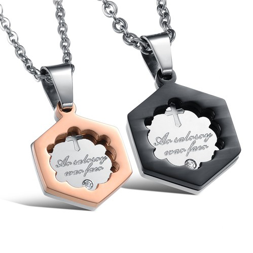 CET Domain SZ17-N293-BLACK Titanium Steel Hexagon Pendant Pair Couple Necklaces-Color Black