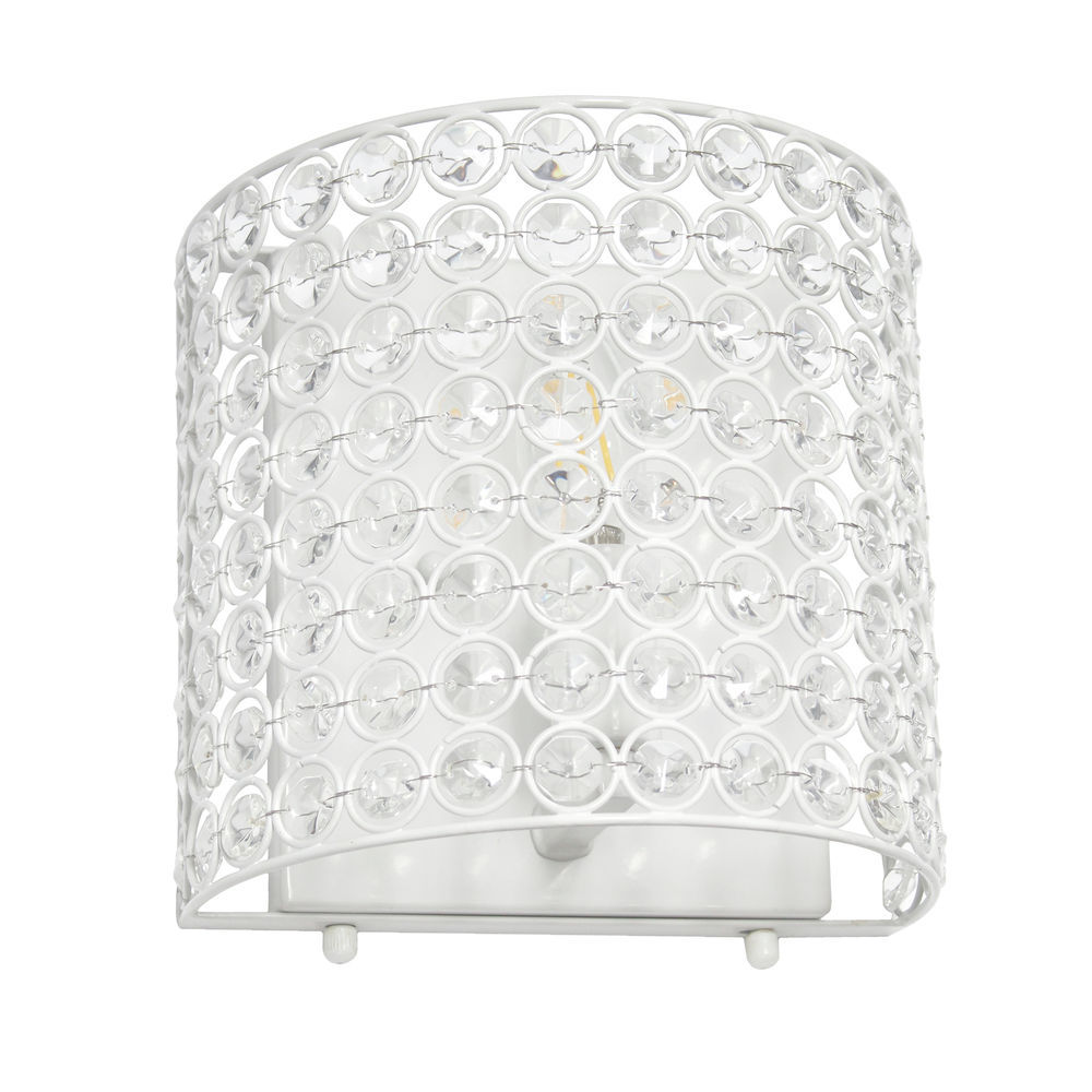 The simple yet chic design of this 1-light wall sconce is sure to update your hallway, bathroom, office or any area in your home with elegance. The metal shade is embellished with charming clear crystals that provide glowing ambient light. This style can easily work with any contemporary or modern decor. Smooth matte white metal frame. Shade measures 8"L x 4.5"W x 8"H and is embellished with clear crystals . Measuring at 8"L x 4.75"W x 8.25"H, this wall sconce is the perfect size for your hallway, bathroom, office, entryway, stairwell, dining room, living room or bedroom. Assembly and hardwiring required. Requires 1 x 40 watt type B10 E12 candelabra base bulb (not included). Additional finish options available. Base Type: E12 Candelabra. Base Dimensions: Back plate: 5.875"L x 0.75"W x 8.25"H. Bulb Included: No. Does the item contain wood: No. Replacement Parts Available: Yes.