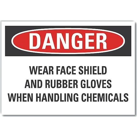 Eye & Hand Danger Label, Horizontal Rectangle, Number of Printed Sides 1, English, Sign Format Traditional OSHA, Sign Legend Wear Face Shield And Rubber Gloves When Handling Chemicals, Sign Legend Background Color White, Sign Legend Style Text