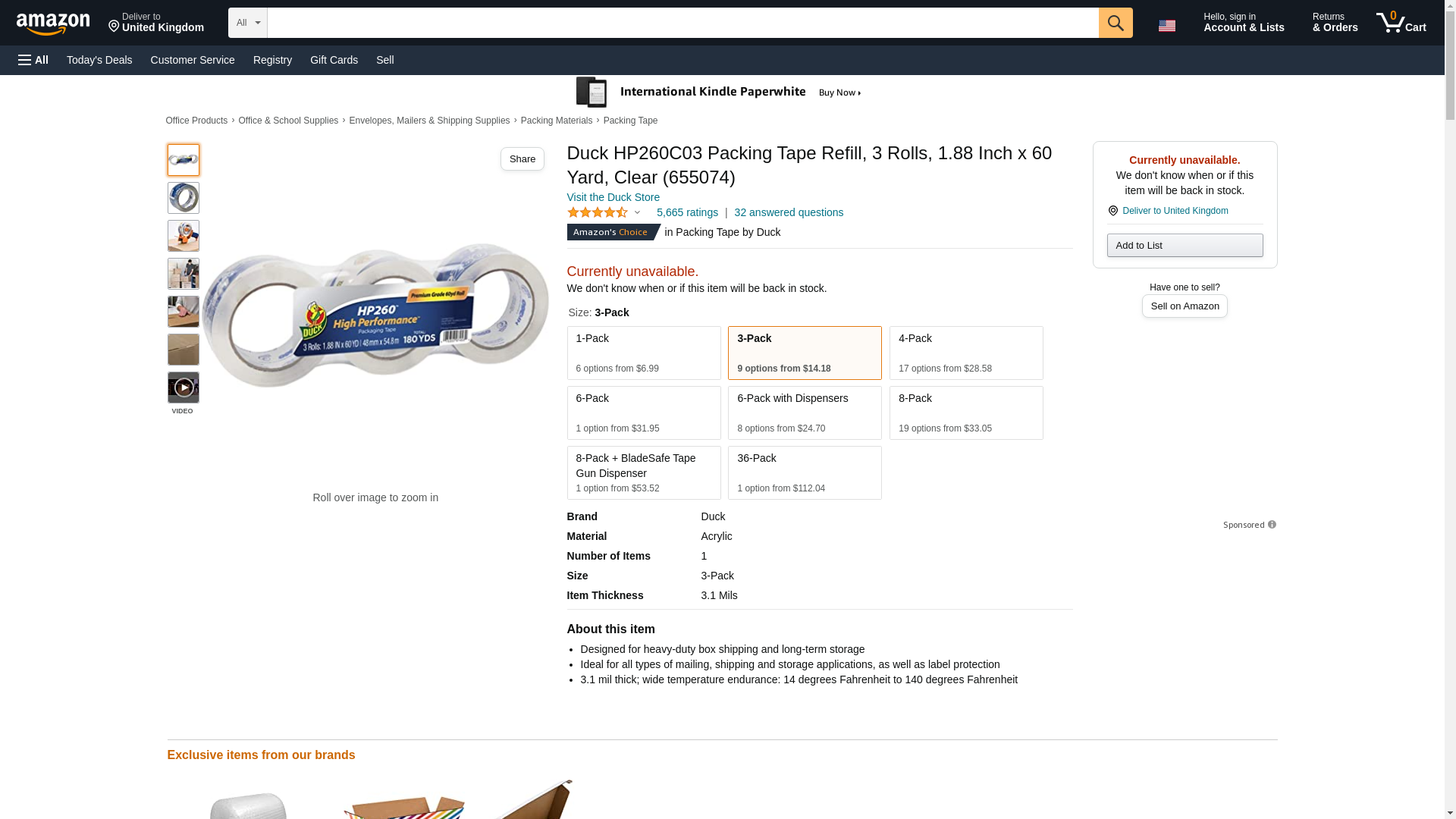 Duck Hp260c03 Carton Sealing Tape 1.88-Inch X 60Yds, 3-Inch Core, Clear, 3/Pack
