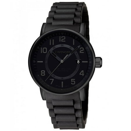 Wenger 01.0341.112 Attitude men's watch features a 43mm wide and 10mm thick black ion plated solid stainless steel case with a fixed bezel and textured push-pull crown. Wenger 01.0341.112 is powered by an accurate Swiss Made Ronda 517-11 1/2 quartz movement. This stylish watch also features a sharp looking black dial with black luminous hands and Arabic numeral hour markers along with the 12/24-hour time and date display functions, scratch resistant sapphire coated mineral crystal and water resistant to 100 meters. Wenger 01.0341.112 is equipped with a 22mm wide black silicone strap with a buckle clasp. Wenger 01.0341.112 men's Attitude black dial black silicone strap watch is brand new and comes in an original Wenger gift box and is backed by a 3 years limited warranty.
