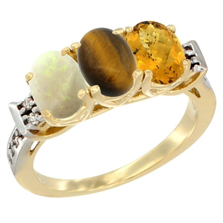 14K Yellow Gold Natural Opal, Tiger Eye & Whisky Quartz Ring 3-Stone Oval 7x5 mm Diamond Accent, sizes 5 - 10