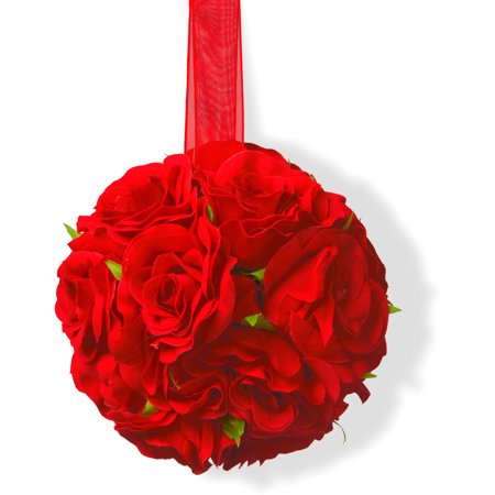 These bright and beautiful flower decorations features blooms of red roses in tight clusters to form a fluffy ball. Peaking through are green leaves for a contrast in colors. Each individual ball has a long red ribbon for ease in hanging. Display as a decoration for Valentines