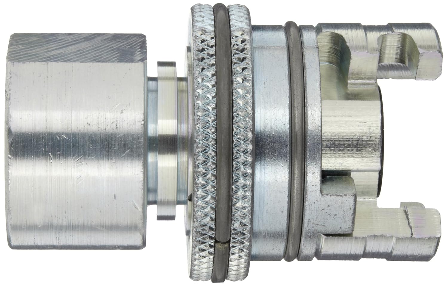Dual lock quick-acting coupling with knurled flanged sleeve. Large, raised collar sleeve permits easier handling when wearing gloves. Trivalent chrome plated. 1/2" Coupling, 3/4" NPT female.
