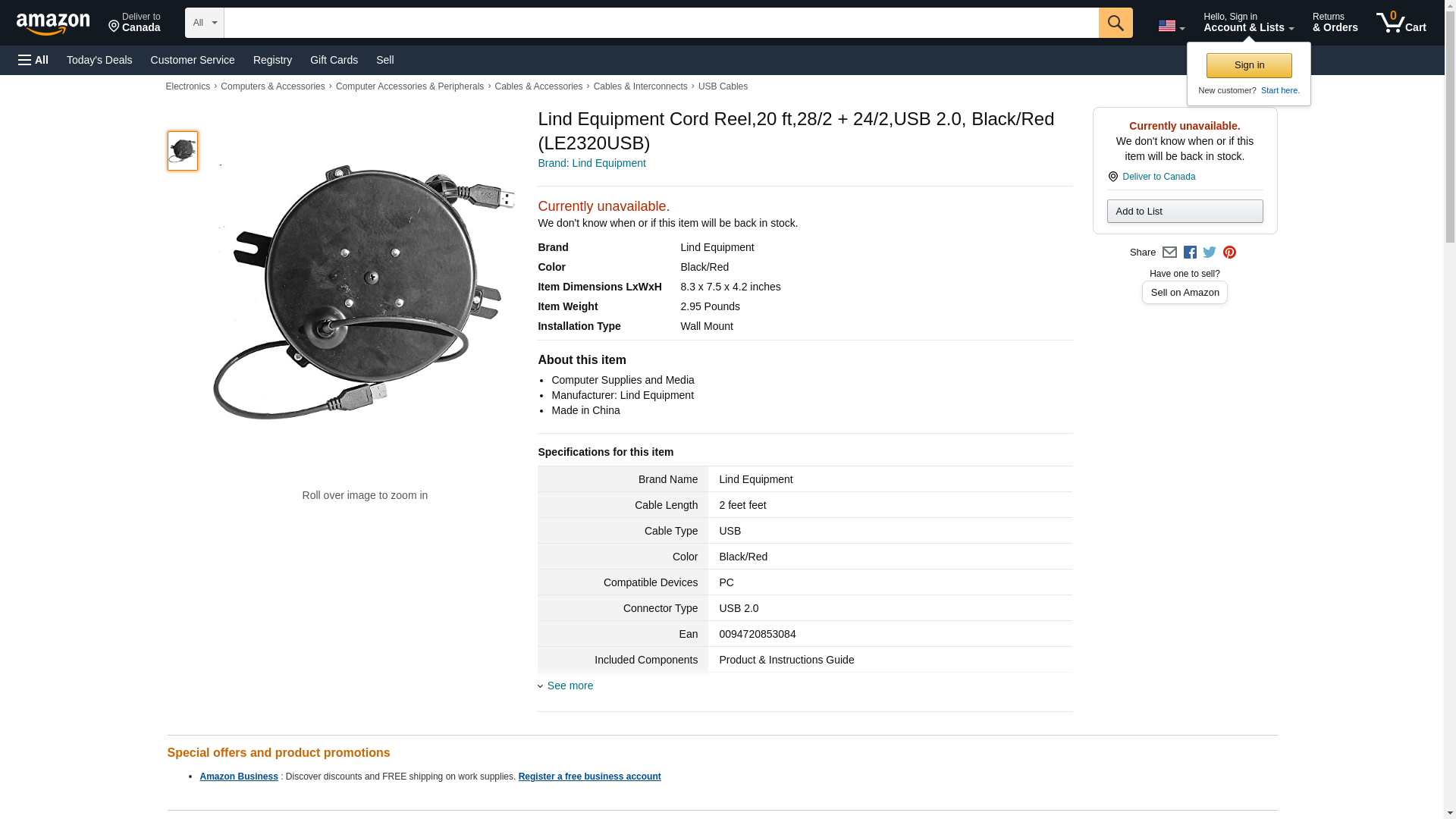 Lind Equipment Cord Reel,20 ft,28/2 + 24/2,USB 2.0, Black/Red (LE2320USB)