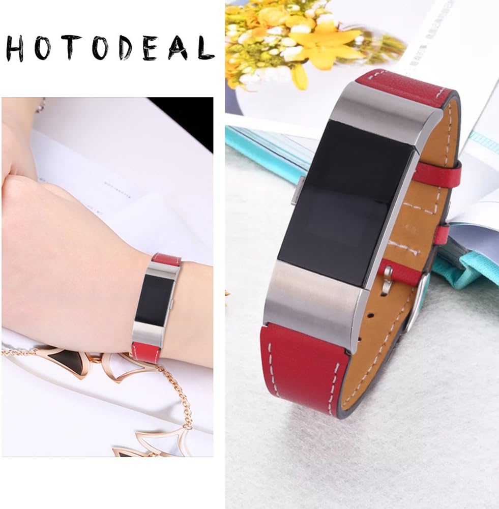Mornex Replacement Leather Band Compatible with Fitbit Charge 2, Classic Genuine Leather Wristband for Men Women(Red-Silver Buckle)