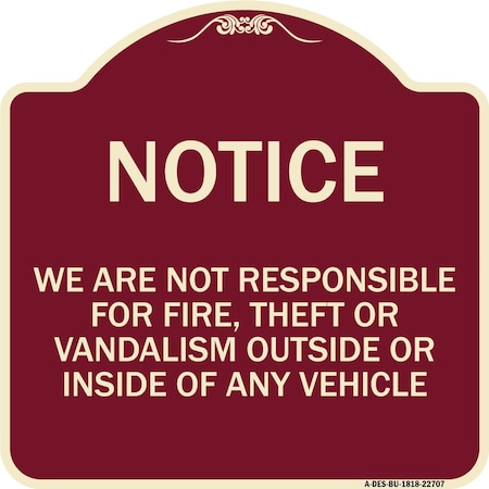 We Are Not Responsible for Fire Theft or Vandalism Outside or Inside of ANY Vehicle Aluminum Sign