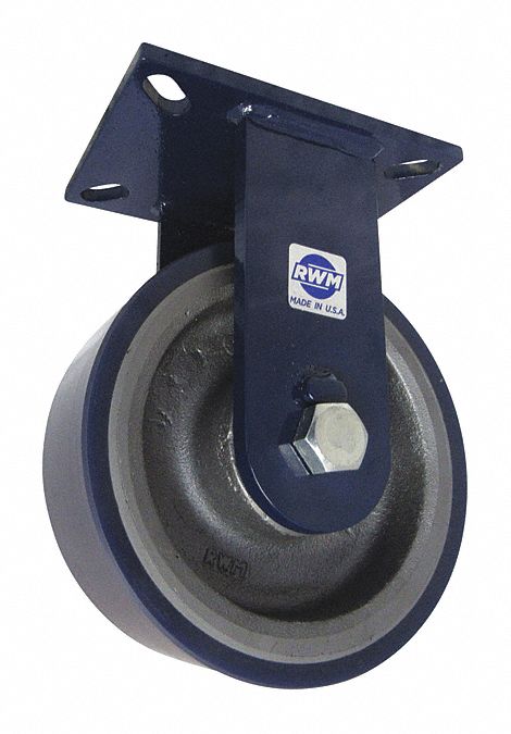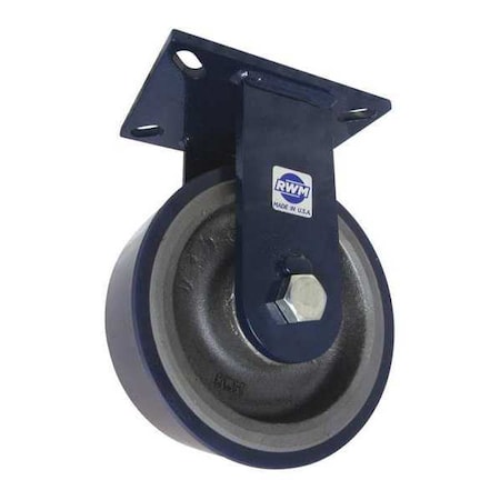 RWM Casters 76 Series Plate Caster, Rigid, Kingpinless, Urethane on Iron Wheel, Roller Bearing, 2500 lbs Capacity, 8" Wheel Dia, 3" Wheel Width, 10-1/2" Mount Height, 7-1/4" Plate Length, 5-1/4" Plate Width