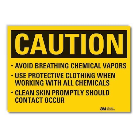 Caution Sign, Horizontal Rectangle, Number of Printed Sides 1, English, Sign Format Traditional OSHA, Sign Legend Avoid Breathing Chemical Vapors Use Protective Clothing When Working With All Chemicals Clean Skin Promptly Should Contact Occur, Sign Legend Background Color Yellow, Sign Legend Style Text