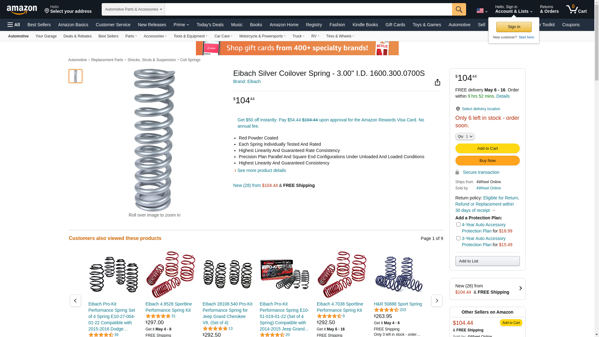 ![]() automotivestuff.com | EIBACH-1600.300.0700S | 1 | -2 | 1 | 1 @ $110.00 |
