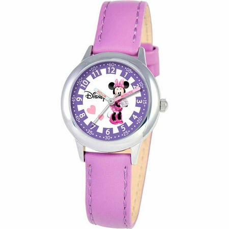 <br /> <b>Disney Minnie Mouse Girls' Stainless Steel Watch, Purple Strap:</b> <ul> <li>30mm stainless steel case</li> <li>14mm purple leather strap</li> <li>Dial features Minnie Mouse</li> <li>Buckle clasp</li> <li>Mineral glass crystal</li> <li>Stainless steel caseback</li> <li>Japanese quartz movement</li> <li>Water-resistant to 100'</li> <li>SR626SW battery</li> </ul>