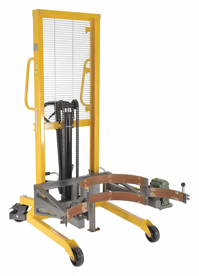 The Economy Portable Drum Lifter/Rotator/Transporter make it easy to lift, transport and tilt drums. Ideal for use in warehouse environments when moving drums to and from racks. Drums can be locked in a vertical position to avoid spills or a horizontal position for draining through a faucet. A manual hand crank allows the drum to tilt. Raise the drums with a manual hand or foot pump operation. This model has a clamp style cradle which securely grips around the drum. For use with steel drums only. Limited Warranty: 30 days. Uniform Capacity (pounds): 550, Drum Size: 55-gallon, Tilt (degrees): 120, Vertical Raised Height (in.): 53, Horizontal (Dump) Raised Height (in.): 58, Drum Type: Steel, Front Rigid Caster (quantity): 2, Front Rigid Caster Width (in.)