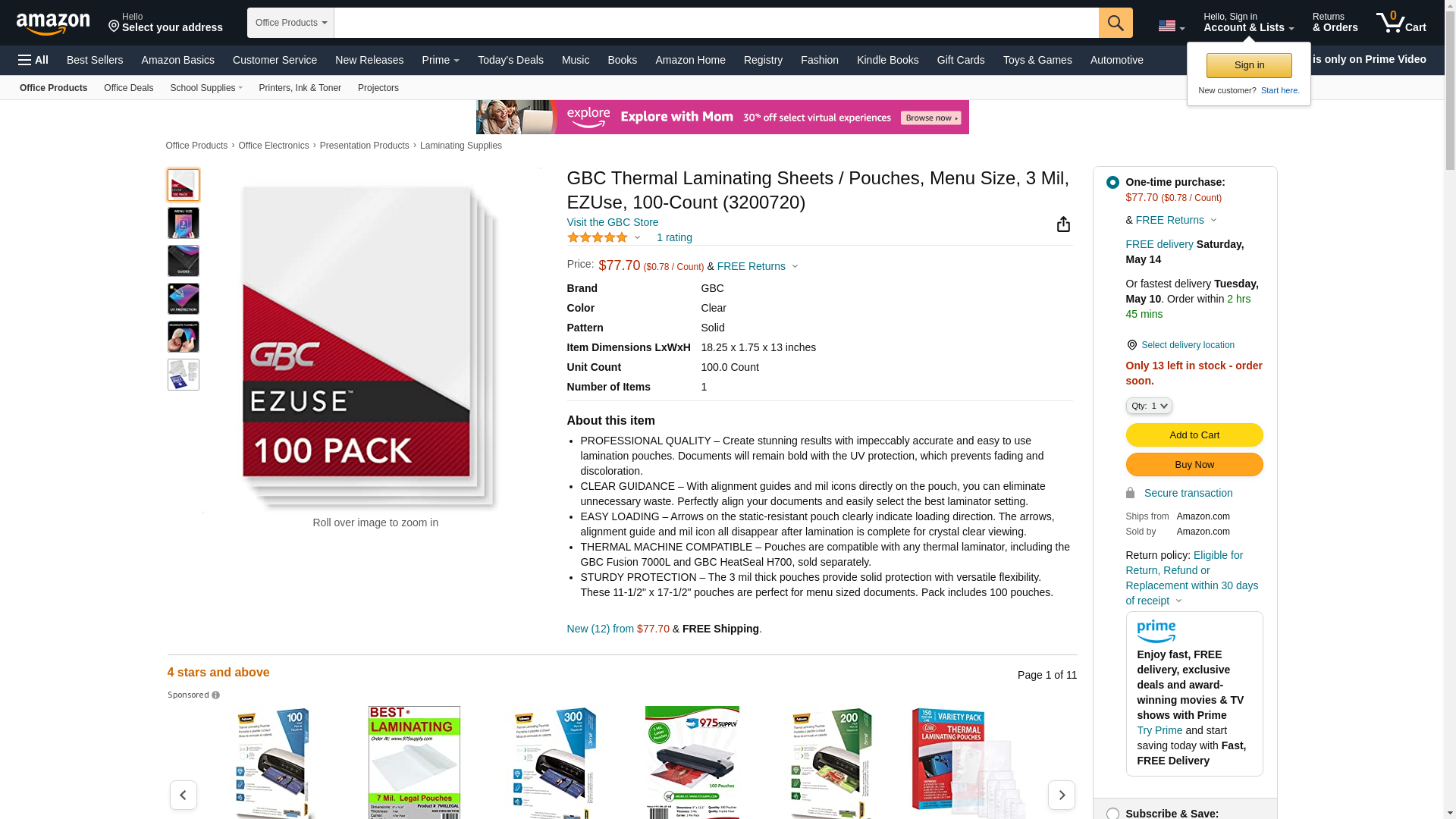GBC Thermal Laminating Sheets / Pouches, Menu Size, 3 Mil, EZUse, 100-Count (3200720)