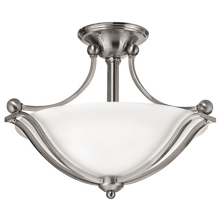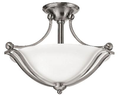 - SEMI-FLUSH LED CEILING LIGHT – The Bolla Indoor LED Semi-Flush Mount Light from Hinkley is thoughtfully designed with etched opal glass and a brushed nickel finish to bring light and refined style to your living space.