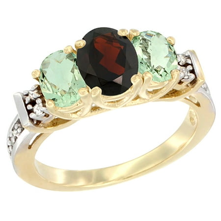 14K Yellow Gold Natural Garnet & Green Amethyst Ring 3-Stone Oval Diamond Accent