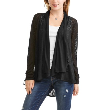 <ul> <li>Polyester/Spandex </li> <li>Machine Wash Cold with Like Colors, Gentle Cycle </li> <li>Sweater Cardigan </li> <li>Slub Textured Knit Body </li> <li>Ribbed Fabric Mix at Shawl Collar </li> <li>Shawl Draped Front </li> <li>Hi - Low Bottom Hem Shape </li> <li>Crochet Medallion Lace Trim Inset at Back Bodice </li> <li>Long Sleeve with Ruched Tie Detail </li> <li>Available Colors: Black, Berry, Teal </li> <li>Available Sizes: S,M,L,XL,XXL </li> </ul><p>Country of Origin: Imported