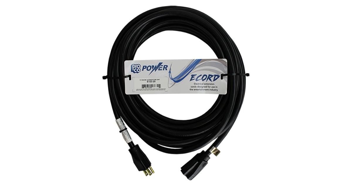 Pro Co E-cord 12ga 50' Power cable. The first extension cord especially designed for the entertainment industry E-Cords are an extremely durable, yet flexible cord in a variety of lengths and gauges for different applications. E-Cords are solid black, for easy concealment on stage...... Pro Co E-cord 12ga 50' Power cable. The first extension cord especially designed for the entertainment industry E-Cords are an extremely durable, yet flexible cord in a variety of lengths and gauges for different applications. E-Cords are solid black, for easy concealment on stage