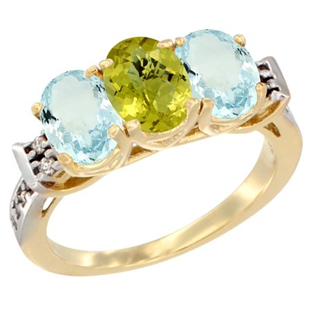 14K Yellow Gold Natural Lemon Quartz & Aquamarine Sides Ring 3-Stone Oval 7x5 mm Diamond Accent, sizes 5 - 10