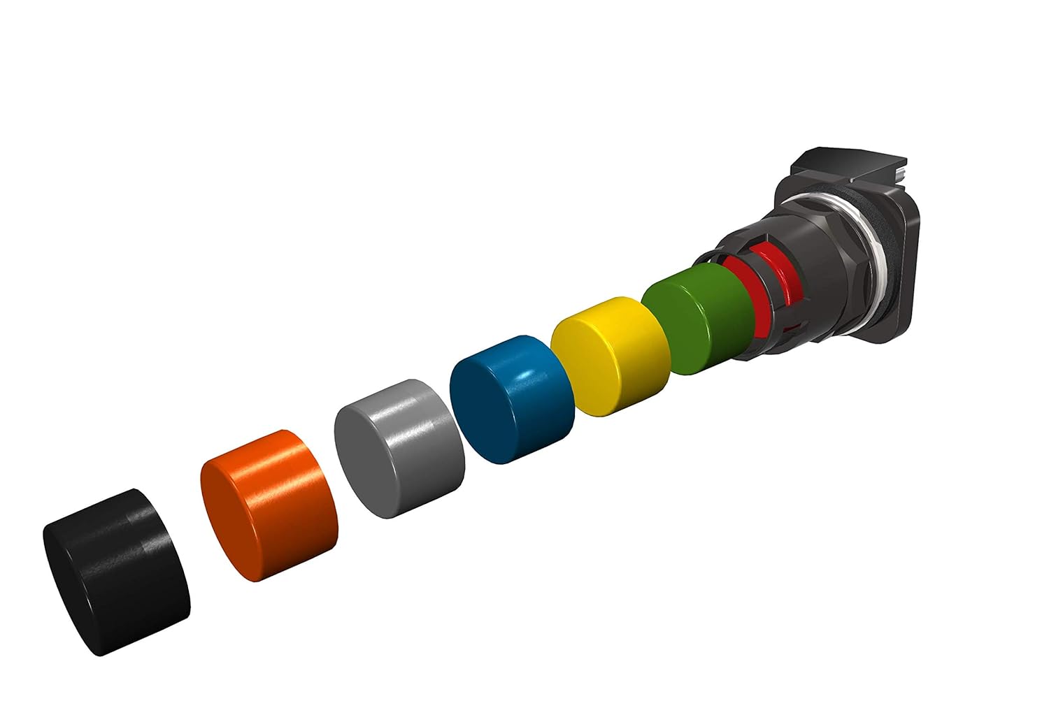 - Complete Pushbutton Unit: Operator, Holder, Contact Block(s). Comes with 1 Cap of Each Color: Black/Red/ Green/Yellow/Blue/Gray/Orange