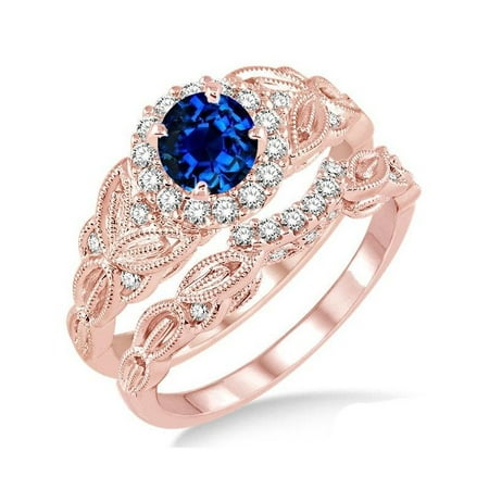 A perfect handmade 1.25 Carat Sapphire and Diamond Vintage floral Bridal Set Engagement Ring in 14k Rose Gold affordable sapphire and diamond engagement ring. The beautiful women's engagement ring is a perfect designer gemstone ring, handmade and customized to perfection. The glittering and shinning perfect sapphire gemstone ring is sure to please her at very first sight.ABOUT THIS RING:-Gold Metal: 14K Rose GoldCenter Gemstone:-Beautiful Round cut blue sapphire. The sapphire is approx 6.5mm in size.Side Stone:-Beautiful glittering diamonds (approx .25 Carat). The diamonds are SI2 quality, and G-H colorTotal Carat Weight:-The total Carat weight of the sapphire and diamond engagement ring is approx 1.25 Carat WeightRing Size:- We can make this ring between sizes from 4.5 to 9.5.Please note that as all our rings are handmade, we can customize this ring in any way you want us to customize it. We can make the ring in different golds: 10k, 14k or 18k, White, Yellow and Rose GoldYou will receive this beautiful ring in a nice jewelry box along with a jewelry certificate to guarantee all the details of the ring.{Production Time}The beautiful round cut sapphire and diamond engagement ring is handmade and customized to your required ring size. We handcraft all our jewelry with great love and dedication. As a result, please note that it will take about 8-10 DAYS, for the order to be ready and shipped. Due to current order rush we are facing, it might not be possible to ship the order earlier..........................................