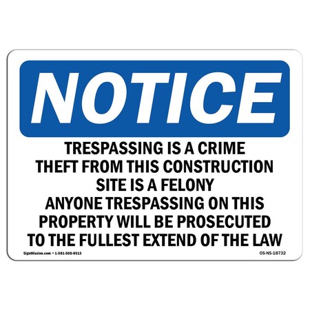 OSHA Notice Sign, Trespassing Is A Crime Theft From This Construction, 24in X 18in Aluminum