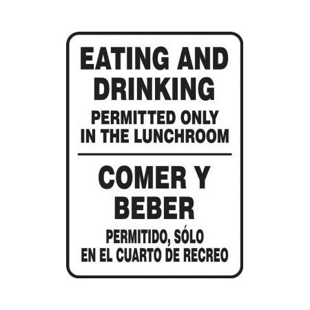 Bilingual Safety Sign: Eating and Drinking Permitted Only in The Lunchroom, Adhesive Dura-Vinyl, 14" x 10"