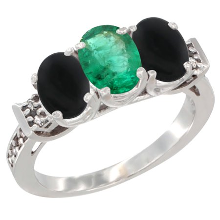 14K White Gold Natural Emerald & Black Onyx Sides Ring 3-Stone Oval 7x5 mm Diamond Accent, sizes 5 - 10