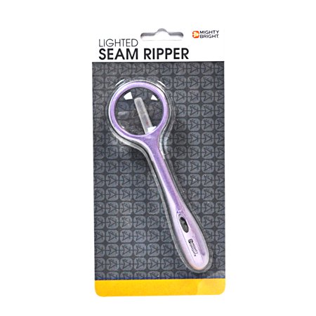 LED Lighted Purple Seam Ripper with Magnifier. The Lighted Seam Ripper and Magnifier is the new secret weapon of quilters, sewers and embroiderers. This innovative model integrates both a light and a magnifier into one cleverly compact unit. The seam ripper features a sharp metal blade that unfolds from the main handle. It allows you to tackle seams and buttons with a genius combination of illumination and magnification. A 1.25in lens quadruples the image size of your blade and stitch. The enlarged area is brightened by an energy-efficient LED, bringing details into sharp focus. Features: Bright white, energy-efficient LED, Durable LED lasts 100,000 hours - no replacement necessary, Precisely engineered optical grade lens spreads light evenly, 1.25in lens, 4x magnifier, Ergonomic handle, Rotating arm, Sharp metal blade, Includes plastic safety cover, Powered by 3 micro cell batteries (included), 5.5in x 0.75in x 1.5in (Length x Height x Width) and Product Weight: 0.7 oz. Manufacturer Part No.: 88513 CHK-88513