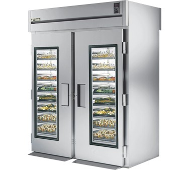 True STG2RRT-2G-2S 2 Section Glass Front / Solid Back Door Stainless Steel Roll-Thru Refrigerator 68" | TigerChef