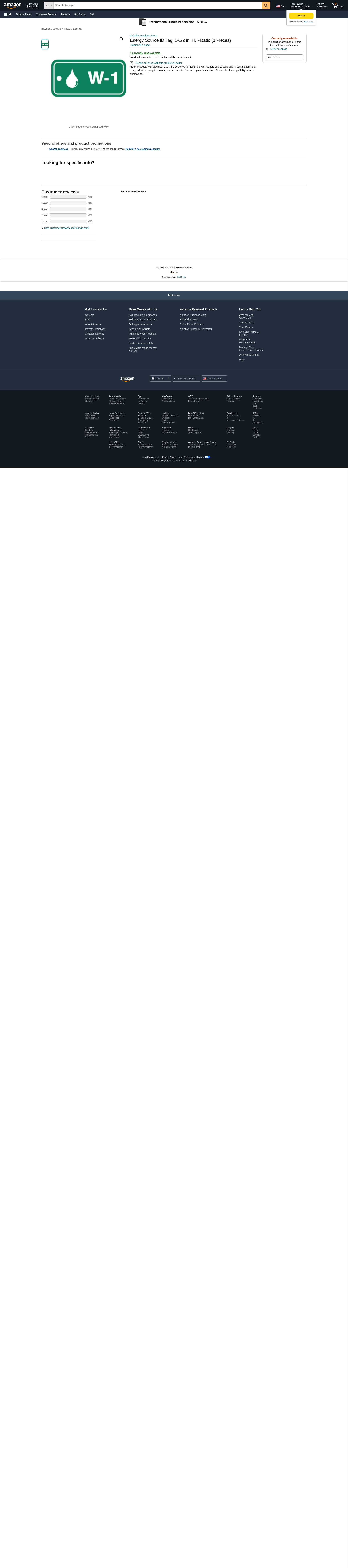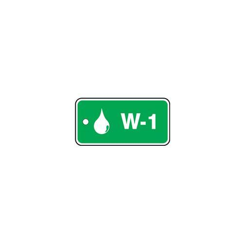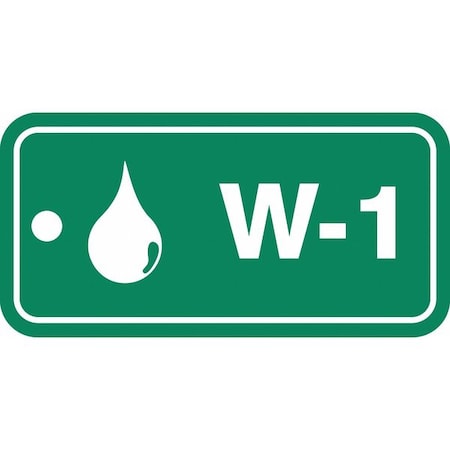 'Energy Source ID Tag, Material Plastic, Legend W-1, Height 1-1/2 In., Width 3 In., Withstand Pull Force 50 lb., Hole Size 3/16 In., Header No Header, Legend Color White, Background Color Green, Legend Style Symbol and Text, Write on Surface No'