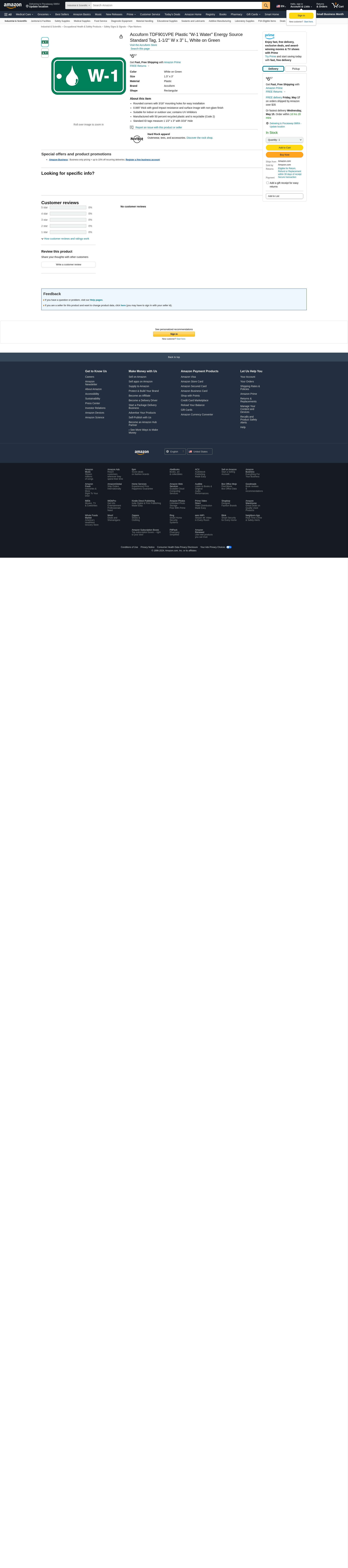 Accuform TDF901VPE Plastic "W-1 Water" Energy Source Standard Tag, 1-1/2" W x 3" L, White on Green