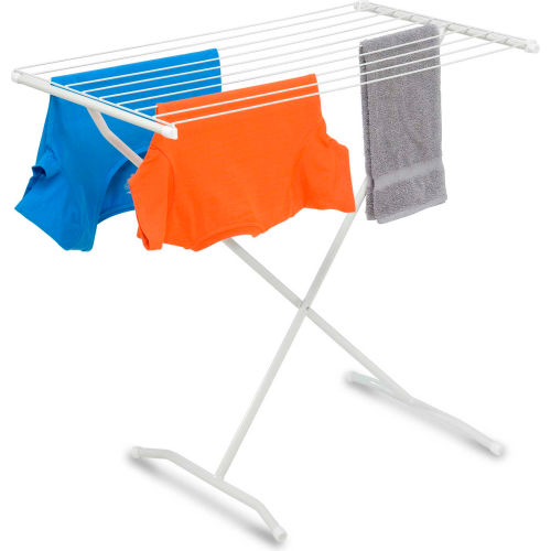 - Metal X-frame rack is foldable, stores easily in laundry room