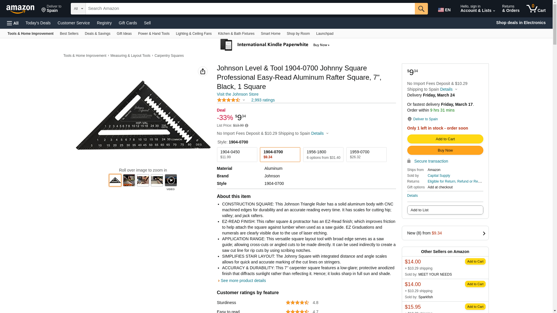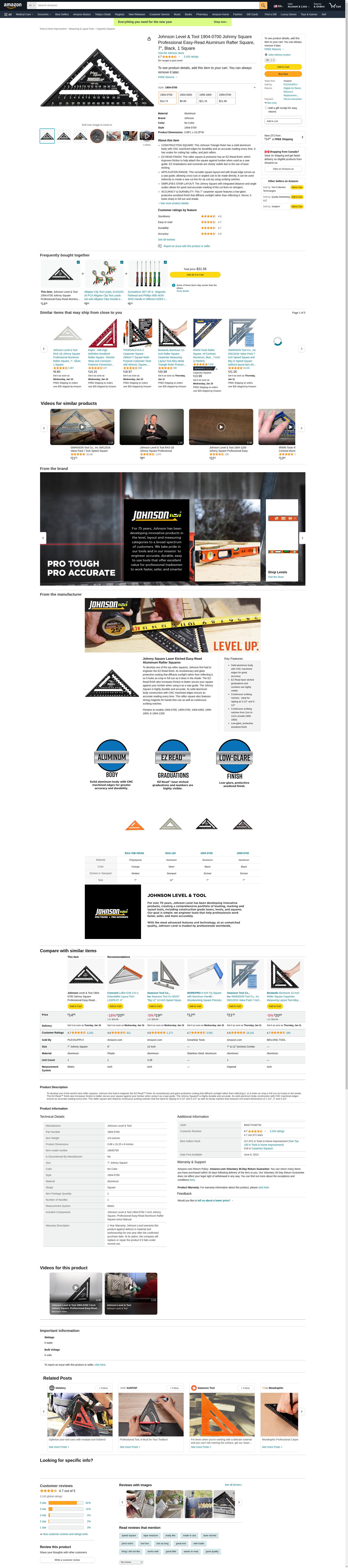 Johnson Level & Tool 1904-0700 Johnny Square Professional Easy-Read Aluminum Rafter Square, 7", Black, 1 Square