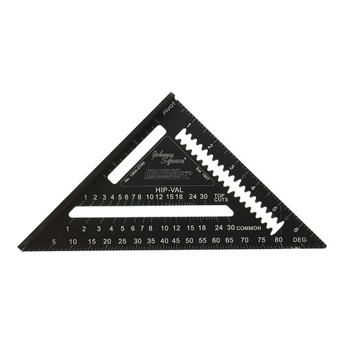 - CONSTRUCTION SQUARE: This Johnson Triangle Ruler has a solid aluminum body with CNC machined edges for durability and an accurate reading every time. It has scales for cutting hip; valley; and jack rafters.