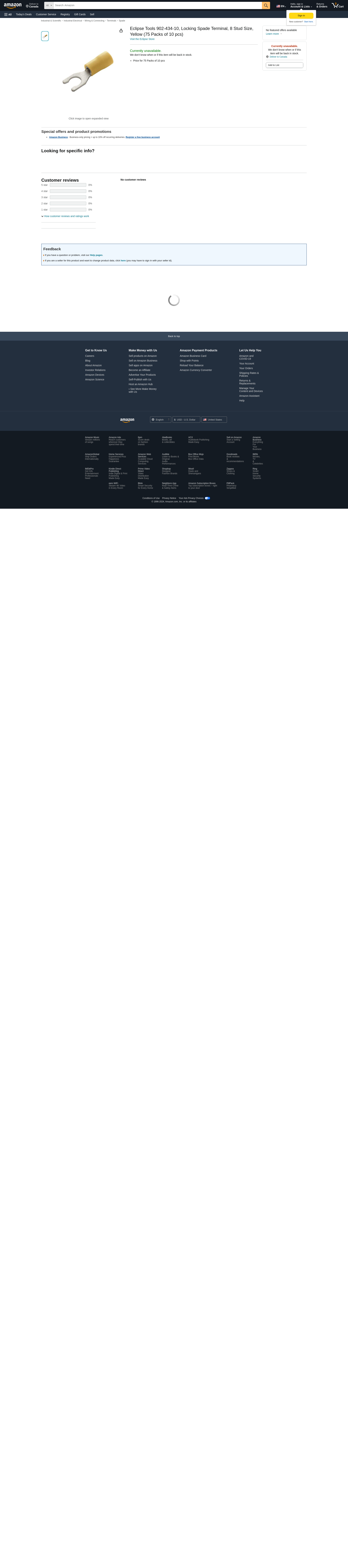 Eclipse Tools 902-434-10, Locking Spade Terminal, 8 Stud Size, Yellow (75 Packs of 10 pcs)