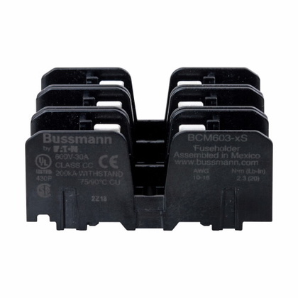 | Feature | <b>Price For:</b> Each <b>Fuse Holder Type</b>: Modular Fuse Holder <b>Product Range</b>: BCM Series <b>Fuse Current</b>: 30A <b>Voltage Rating VAC</b>: 600V <b>Voltage Rating VDC</b>: - <b>Fuse Size Held</b>: Class CC <b>No. of Fuses</b>: 3Fuses <b>Holder Terminals</b>: Screw |