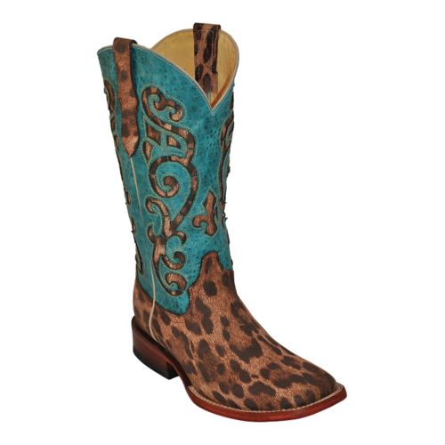 Ferrini 8429350095B Ladies Print Leopard Square Toe Boots, Tan & Turquoise - Size 9.5B