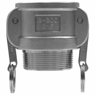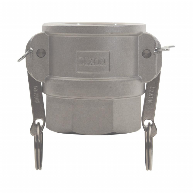 WARNING : Under no circumstances should cam and groove couplings be used for compressed air or steam service.<br><br>Dixon Sanitary Cam and Groove Global Type D Adapters are Female Cam Coupler x Female NPT fittings for transitioning to a camlock connection. These Type D camlock fittings are available from 1/2" up to 4" in A380 Permanent Mold Aluminum or 316 Investment Cast Stainless Steel.<br><br>Dixon camlock fittings are all precision machined to rigid tolerances and designed to be interchangeable with all products produced to Commercial Item Description A-A-59326B. However, no standard exists for the 1/2" and 8" fittings and generally these will not interchange with other manufacturers. All couplers, regardless of casting material, utilize durable stainless steel cam arm pins that will not rust or bind. The couplers also feature a recess to hold the gasket firmly in place, ensuring proper placement and eliminating any chance for leakage.<br><br>Cam and Groove fittings are designed for use as a hose coupling that allows quick connect capabilities to increase operator productivity. To secure a connection, simply slide the adapter into the coupler, and with normal hand pressure press the cam levers down. Uncoupling is just as simple, just lift the cam arms and remove the adapter. Dixon Sanitary also offers Dust Plugs and Dust Caps to keep hoses and process tubes clean while fittings are disconnected.<br><br>Dixon Cam and Groove Fittings Features:<br><br>- Precision Machined<br>- Rigid Tolerances<br>- Recessed Gasket Slots<br>- Buna N Seal Standard (alternates available)<br>- Stainless Steel Cam Arm Pins<br>- Interchangeable with most manufacturers
