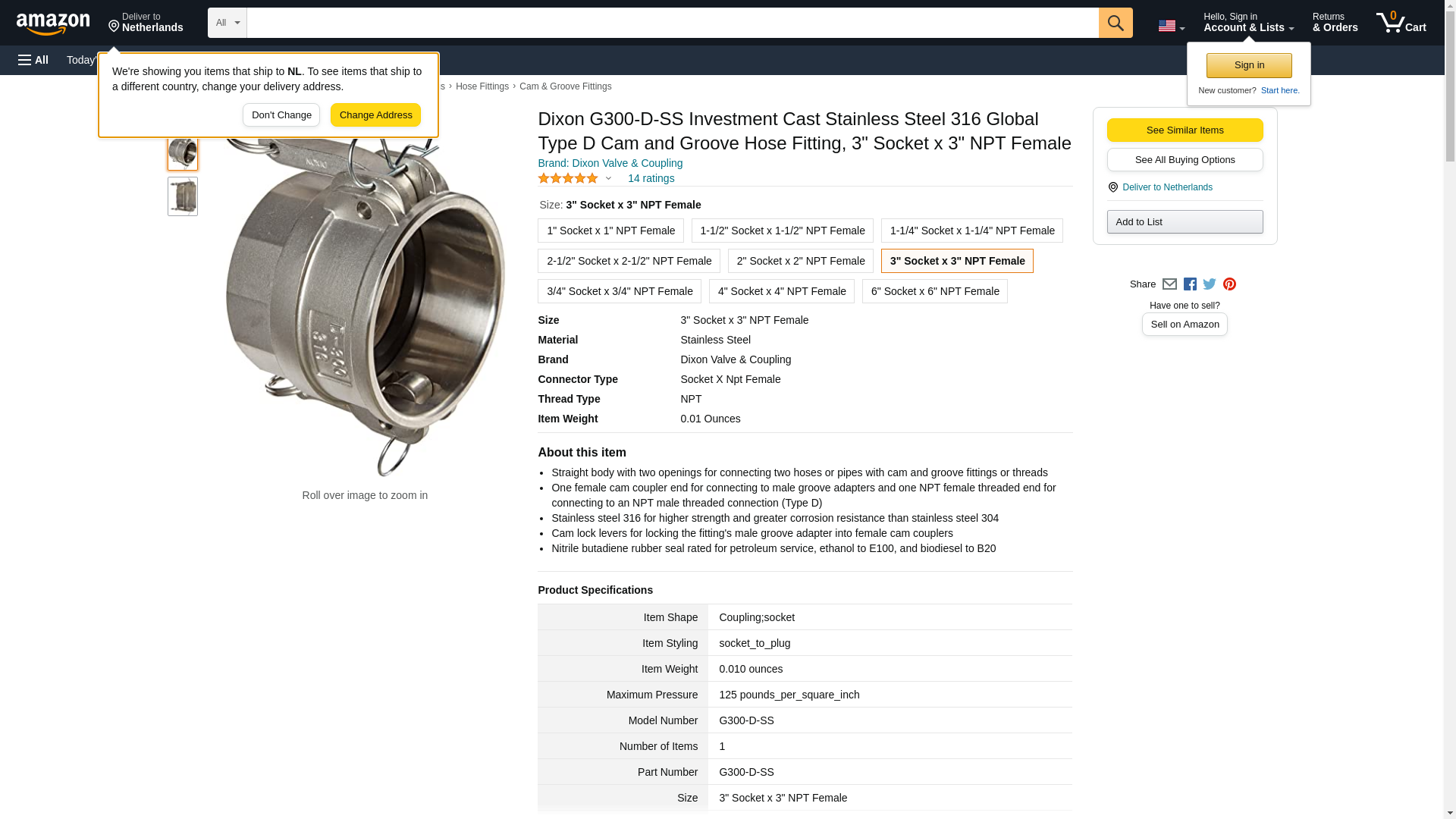<p><strong>Dixon, G300-D-SS, 3" Global Cam & Groove Type D Coupler Cast Stainless Steel x Female NPT</strong></p><p><strong>Applications</strong></p><ul><li>Designed for use with liquids</li></ul><p><strong>Specifications</strong></p><ul><li>Designed to interchange with all products produced to A-A-59326D</li></ul><p><strong>Features</strong></p><ul><li>Made to Dixon specifications and branded Dixon</li></ul><p><strong>Construction</strong></p><ul><li>Buna seals</li></ul><p><strong>How it works</strong></p><ul><li>To make a connection, simply slide the adapter into the coupler and with normal hand pressure, press the cam levers down.</li><li>Uncoupling is as quick and simple as coupling. Just lift the cam arms and remove the adapter.</li></ul><p><strong>Safety notes</strong></p><ul><li>Under no circumstances should cam and groove couplings be used for compressed air or steam service!</li><li>Pressure rating recommendations are based on the use of mating Dixon fittings at ambient temperature 70°F with a standard seal installed.</li></ul>