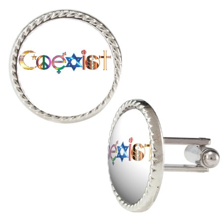 Coexist Illustration of Different Faiths Cufflinks. The image is displayed under photo-optic quality acrylic for a perfectly clear glossy image that is also protected from wear and tear. Ask us about our custom cufflinks! We can do almost any image you may like, including your family pet, new baby or vacation photo. All cufflinks feature a swivel back fastener. Fasteners may differ slightly due to availability of fasteners during time of production. All fasteners are of the same high quality. 100% hand crafted in the USA. SKU #34942