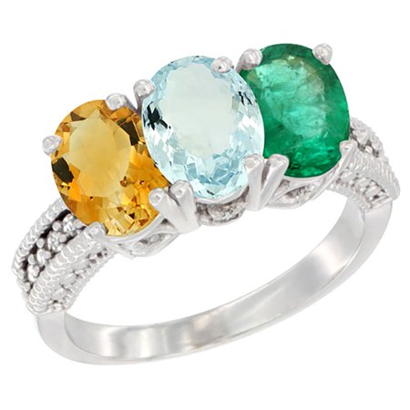 14K White Gold Natural Citrine, Aquamarine & Emerald Ring 3-Stone 7x5 mm Oval Diamond Accent, sizes 5 - 10