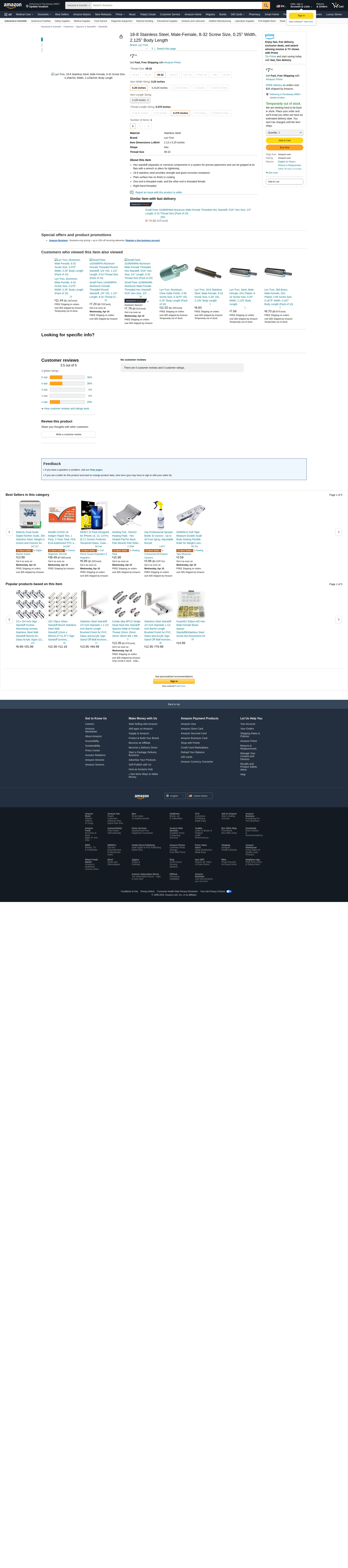 Lyn-Tron, 18-8 Stainless Steel, Male-Female, 8-32 Screw Size, 0.25" Width, 2.125" Body Length