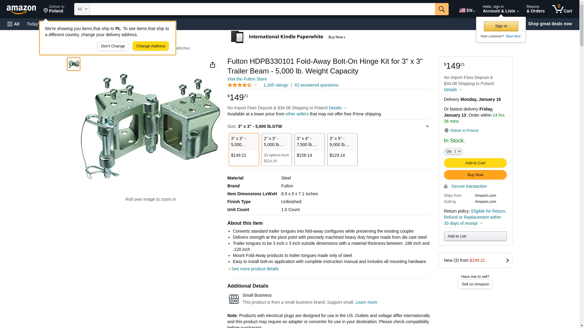 Fold-Away Bolt-On Hinge Kit Features: Hinge Kit 3" x 3" Trailer Beam Z-Max 600 Zinc Finish Rating 5,000 lbs. 48" Pivot Limited 5-Year Warranty Product : FULTON FOLD-AWAY BOLT-ON HINGE KIT 3" X 3" TRAILER TONGUES Manufacturer : FULTON PERFORMANCE Manufacturer Part No : HDPB330101 UPC : 783192015723