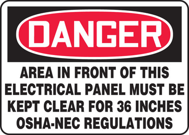 <BR>Electrical Safety Signs. DANGER AREA IN FRONT OF THIS ELECTRICAL PANEL MUST BE KEPT CLEAR FOR 36 INCHES OSHA-NEC REGULATIONS. 7" x 10" Plastic Sign<BR>