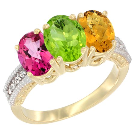 10K Yellow Gold Diamond Natural Pink Topaz, Peridot & Whisky Quartz Ring 3-Stone Oval 7x5 mm, sizes 5 - 10