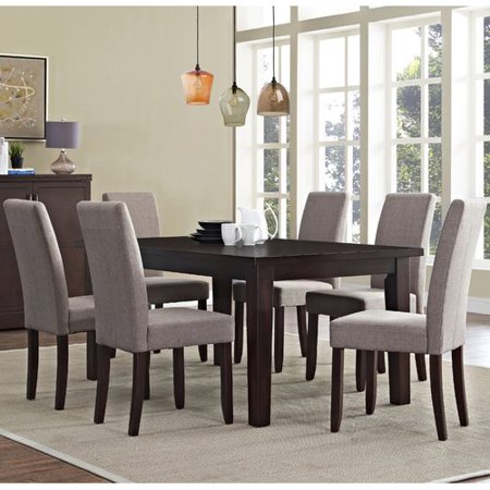SIMPLIHOME Acadian Transitional 7 Pc Dining Set with 6 Upholstered Parson Chairs in Light Mocha Linen Look Fabric and 66 Inch Wide Table, For the Dining Room and Kitchen