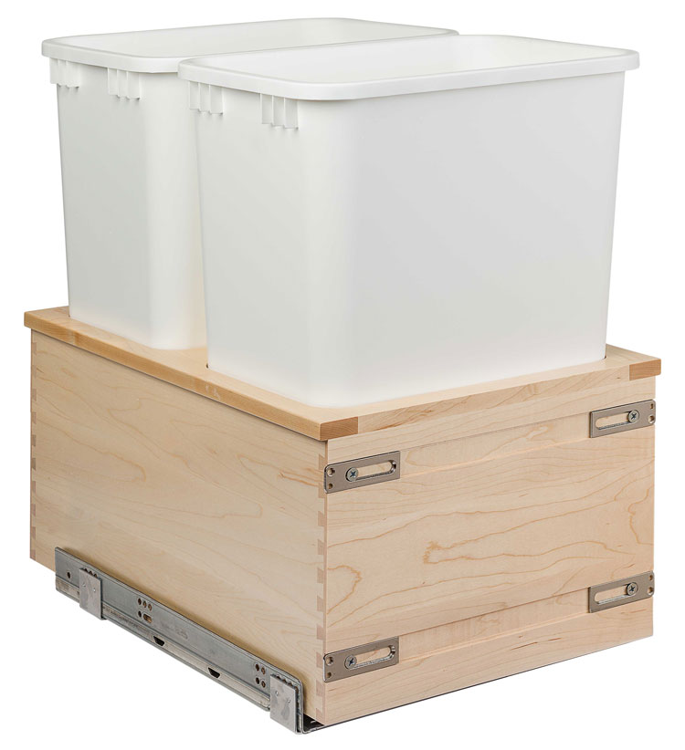 Bin Color/Finish: White. Bin Material: Polymer. Country of Origin: U.S.A.. Depth: 22-1/2". Height: 23-5/8". Key Features: Solid maple box with dovetail construction. Natural pre-finished wood. Solid maple face frame top routed to perfectly match waste bin profile. BLUM soft-close undermount slides. Fully adjustable door mount brackets. works for overlay and inset applications. Material: Maple. Number of Bins: 2. Product Finish: Wood/White. Product Type: Double Pullout Waste Container. Sold: Includes (1) wood container frame, soft-close slides & (2) 50 qt waste bin. Waste Container Capacity: 50 Quart X 2. Width: 14-7/8".