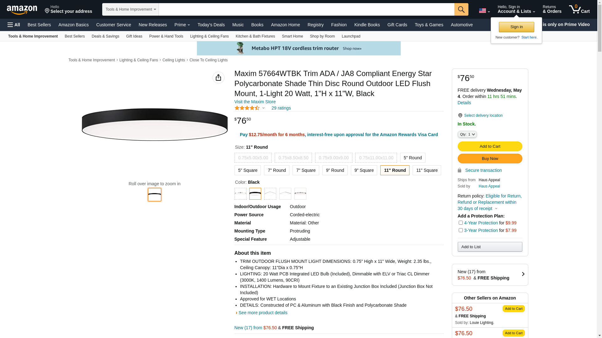 This 1 light Flush Mount from the Trim collection by Maxim will enhance your home with a perfect mix of form and function. The features include a Black finish applied by experts. Product Features Include: Brand: Maxim Lighting, Collection: Trim, SKU: 57664WTBK, UPC: 783209233461, Category: Flush Mount, Finish: Black, Glass: White, Shade: Polycarbonate, Material: PC/Aluminum, Length: 11.00 in., Width: 11.00 in., Height: 0.75 in., Backplate/Canopy Width: 11.00 in., Backplate/Canopy Length: 11.00 in., Backplate/Canopy Thickness: 0.75 in., Weight: 2.35 lb., Included Lead Wire: 8.00, Warranty: 5 Years, Bulbs Included: Yes, Bulb Category: LED, Primary Bulb(s): 1 x 20.00 watts PCB Integrated , Color Temperature: 3000K, Color Rendering Index: 90.0000, Total Lumens: 1450, Voltage: 120, Safety Rating: cETLus Wet, Energy Star Efficient, ADA Approved, Title 24 Approved