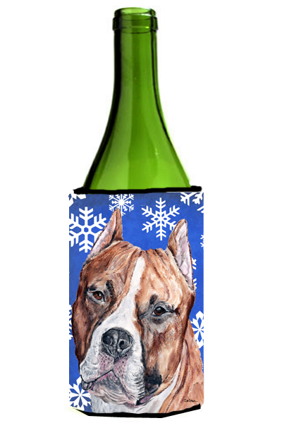 Caroline's Treasures SC9776LITERK Staffordshire Bull Terrier Staffie Winter Snowflakes Wine Bottle Hugger Bottle Cooler Sleeve Hugger Machine Washable Collapsible Insulator Beverage Insulated Holder